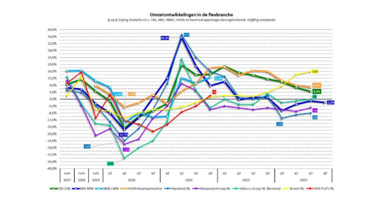 ZiPredactie 6 december 2023 0 reacties Print CBS: omzet flexbranche groeit met ruim 4% in derde kwartaalDe vierprocents groei van de markt die het CBS meldt geldt niet voor alle sectoren. Een overzicht. De omzet van de flexbranche is het derde kwartaal van dit jaar met 4,4% gegroeid vergeleken met het derde kwartaal van 2022. Het aantal gerealiseerde uren in de flexbranche daalt nog steeds. Dat blijkt uit de meest recente cijfers van het CBS. De omzet in deze flexbranche stijgt nu al tien kwartalen op rij, maar de laatste zes kwartalen neemt de omzetgroei wel af. De omzet van de flexbranche groeide in het tweede kwartaal nog met 6,7% ten opzichte van vorig jaar. De totaal bemiddelde uren in de flexbranche blijven dalen. Het aantal gerealiseerde uren in de flexbranche daalde in het derde kwartaal van dit jaar met -6,6% ten opzichte van dezelfde periode vorig jaar. Op basis van deze CBS-data kan de conclusie worden getrokken dat de gemiddelde stijging van het uurtarief +11,8% bedraagt. Analyse flexbranche Flexstrateeg en hoofdredacteur FlexNieuws Wim Davidse maakt op basis van alle marktcijfers over het derde kwartaal (zie grafiek) de volgende analyse: Detacheerders Detacheringsbureaus presteerden volgens de MarktMonitor van de VvDN (Vereniging van Detacheerders Nederland) in het derde kwartaal van dit jaar met een omzetgroei van +6,9% beter dan de totale markt. Grote generieke uitzenders Detacheerders deden het ook aanzienlijk beter dan de grote generieke staffing companies. Randstad Nederland zag de omzet flinke dalen (-8%), en dat geldt in iets minder mate ook voor ManpowerGroup Nederland (-5%). Adecco Group Benelux kende overigens een omzetstabilisatie in het derde kwartaal van dit jaar. Kleine en middelgrote uitzenders De ABU MarktMonitor kwam uit op een omzetdaling van -1% in het derde kwartaal van dit jaar. De kleine en middelgrote (en vaak meer gespecialiseerde) uitzendbureaus deden het gemiddeld beter dan de ABU Marktmonitor. De NBBU is sinds 2022 gestopt met het publiceren van de omzetontwikkelingen, maar de schatting is dat hun omzetontwikkeling ongeveer op of misschien zelfs wat hoger dan het VvDN-niveau ligt. CBS, cijfers, flexbranche Print Over de auteur Over ZiPredactie De ZiPredactie plaatst hier interviews en eigen artikelen. Daarnaast persberichten, aankondigingen of (met toestemming) overgenomen artikelen. (contact: info[AT]zipconomy.nl) Bekijk alle berichten van ZiPredactie