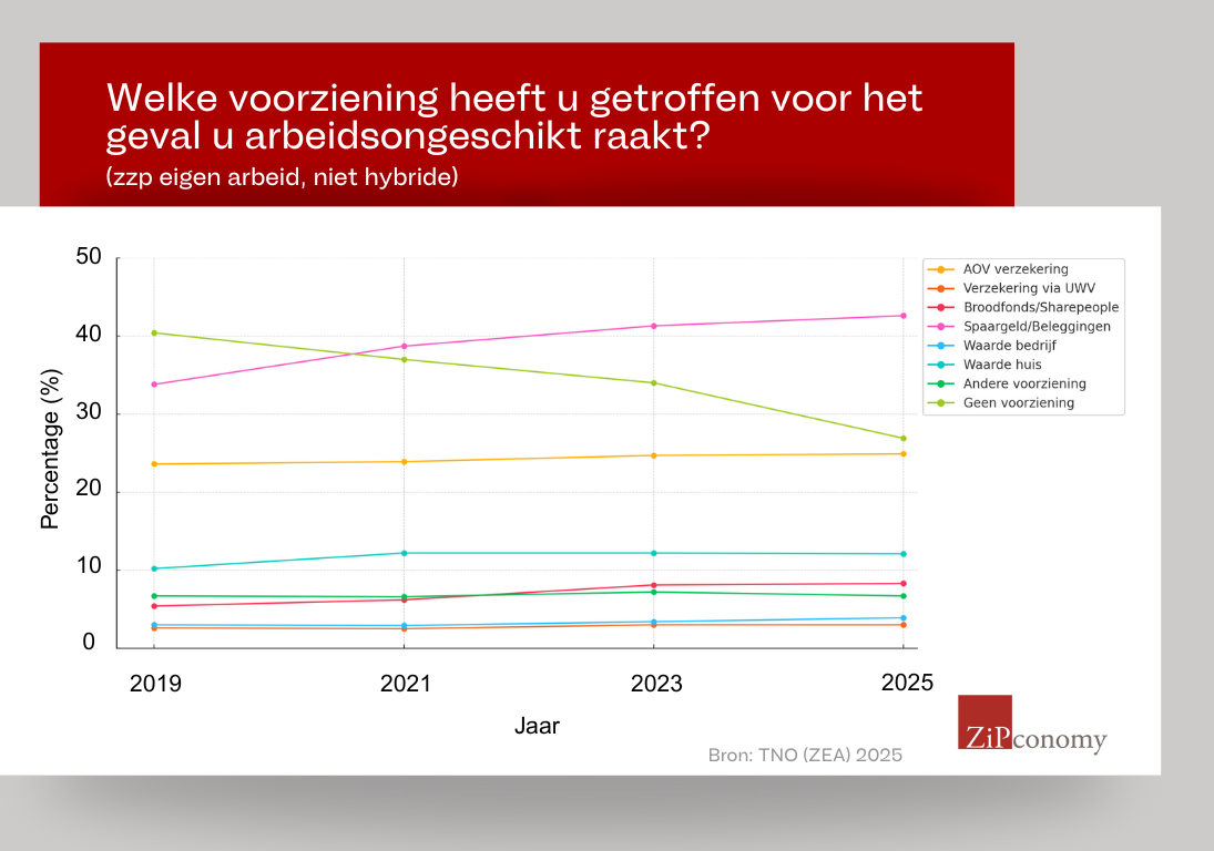Claartje Vogel 5 augustus 2025 Eén reactie Print Interimmers en freelancers hebben vaker iets geregeld voor arbeidsongeschiktheid. Maar dat is lang niet altijd een aovMeer zelfstandig professionals hebben een vangnet voor het geval zij ziek worden of arbeidsongeschikt raken. Toch blijft het percentage zzp’ers met een officiële arbeidsongeschiktheidsverzekering stabiel. Aov-expert Cosmas Blaauw (SharePeople): “Als de minister woord houdt en snel met een verplichting komt, verwacht ik eind 2025 flink meer aanvragen.”In 2025 heeft een kwart van alle zelfstandigen die eigen arbeid verkopen (24,9%) een arbeidsongeschiktheidsverzekering (aov). Dat zijn ongeveer net zoveel interim-professionals en freelancers als in 2023 (24,7%), maar het aandeel zelfstandigen dat ‘iets’ geregeld heeft voor het geval zij arbeidsongeschikt raken is fors gestegen. In 2019 had 40% geen enkele voorziening, in 2023 daalde dat naar 34% en nu is het nog maar 26,9%. Dat blijkt uit cijfers van de Zelfstandigen Enquête Arbeid (ZEA) 2025. Elke twee jaar doen TNO en het Centraal Bureau voor de Statistiek (CBS) onderzoek naar de arbeidsomstandigheden en inzetbaarheid van zelfstandigen. ZiPconomy analyseert en vergelijkt de cijfers om tot meer inzichten te komen. Spaargeld, broodfondsen of waarde van het huis Zo’n 42,6% van de freelancers en interimmers heeft spaargeld of beleggingen om arbeidsongeschiktheid op te vangen. 12,1% verwacht dat de waarde van zijn koophuis genoeg is om het risico te dekken. Zo’n 8,3% zit bij een broodfonds, voorzieningenfonds of SharePeople. Grafiek: Welke voorziening heeft u getroffen voor het geval u arbeidsongeschikt raakt? (Bron: TNO (ZEA) 2025) Momentopnames Het aantal zzp’ers met een voorziening tegen arbeidsongeschiktheid is toegenomen, maar het aandeel freelancers of interimmers met een aov is dus vrijwel even groot als in 2023. Hoe zit dat? “Het zijn momentopnames, maar wie goed kijkt naar de tussenliggende periode ziet een flinke toename van mensen die inmiddels iets hebben geregeld”, zegt Cosmas Blaauw, oprichter van de SharePeople Coöperatie. SharePeople is een alternatief voor een aov, waarbij zelfstandigen elkaar financieel steunen via donaties tijdens ziekte. De voorziening kunnen zij aanvullen met een collectieve aov met een wachttijd van twee jaar. Blaauw vertelt dat er in 2024 een flinke toename was van het aantal zzp’ers dat zo’n aov afsloot. Sterke toename in 2024, fors minder interesse in 2025 “Dat kwam door marketingcampagnes, meer aanbod en het nieuws dat de overheid met een verplichte zzp-aov zou komen”, vertelt hij. “In een jaar sloten we ineens 3000 polissen af en werden we marktleider. Maar toen de minister in september 2024 het wetsvoorstel Basisverzekering Arbeidsongeschiktheid Zelfstandigen uitstelde, stortte de vraag naar aov’s als een plumpudding in elkaar.” Zzp’ers die al een aov hadden afgesloten zijn gebleven, vertelt hij. “Maar er kwamen er nog maar weinig bij. Bovendien zijn er in 2025 veel meer zzp’ers gestopt dan andere jaren door de geïntensiveerde handhaving op schijnzelfstandigheid. Die zegden dus ook hun aov op.” Hij verwacht binnenkort weer een stijging. “Als de demissionaire minister van Sociale Zaken woord houdt en het wetsvoorstel voor de aov voor zelfstandigen na deze zomer nog naar de Tweede Kamer stuurt, dan verwacht ik eind 2025 weer een grote nieuwe instroom van aanvragen.” Lees ook: Controversieel of niet? Wat betekent politieke crisis voor toekomst van zzp-wetgeving en arbeidsmarkthervorming? Toename alternatieve voorzieningen Volgens Blaauw is het in elk geval een goede stap vooruit dat meer mensen een of andere voorziening hebben om arbeidsongeschiktheid financieel op te vangen. “Maar het is niet altijd genoeg”, zegt hij. “Met een schenkkring of spaargeld kun je vaak wel de eerste twee jaar van arbeidsongeschiktheid financieel opvangen. Maar bij blijvende arbeidsongeschiktheid heb je ook daarna nog inkomen nodig. Als je ziek wordt op je veertigste, moet je een gigantisch financieel gat vangen tot je pensioen.” Reden om wel of geen aov af te sluiten Uit de enquête blijken ook de voornaamste redenen om een wel een aov af te sluiten (2025): 60,4% kan het financiële risico niet zelf dragen 28,9% kan niet terugvallen op het inkomen zijn de partner 12,3% ziet een hoog risico op arbeidsongeschiktheid in de branche 2,7% heeft of had gezondheidsproblemen 22,2% heeft een andere reden. Redenen om juist geen aov te hebben: Baten wegen niet op tegen de kosten (43,3%, was 46,6% in 2021) Kwart kan het niet betalen (was 33% in 2023) 17% kan terugvallen op inkomen van de partner (was 20,5% in 2023) Sommigen worden niet geaccepteerd vanwege leeftijd (6,8%) of gezondheid (6,8%). Voor 10% is niet duidelijk wanneer een verzekeraar uitkeert. 9,4% vertrouwt de keuring van verzekeraars niet. Traditionele rolpatronen Zelfstandigen die hun eigen arbeid verkopen hebben over het algemeen vaker iets geregeld dan zelfstandigen die producten verkopen. Verder zijn er flinke verschillen tussen mannen en vrouwen. Vrouwelijke zzp’ers hebben vaker geen voorziening (31%) dan mannen (25%). Blaauw ziet dat ook terug bij SharePeople. “58% van onze verzekerden is man, 42% vrouw. Dat heeft waarschijnlijk toch te maken met de traditionele rolverdeling: mannen zijn nog steeds vaker hoofdkostwinner dan vrouwen.” Verschillen per beroep Verder zijn er verschillen per beroepsgroep. Zo hebben zzp’ers in de zakelijke dienstverlening vaker geen voorziening (28%) dan bijvoorbeeld zelfstandigen in de landbouw (20%) of (bouw)nijverheid (24%). “Ik denk dat zelfstandigen in de zakelijke dienstverlening het risico op arbeidsongeschiktheid onderschatten”, zegt Blaauw. “Ze denken: ik heb geen zware baan, wat kan mij nou overkomen? Dat is een domme gedachte. Bij ongeveer 30% van de arbeidsongeschiktheid spelen psychische klachten zoals burn-out een rol.” Blaauw: ‘Verzekeraars, accepteer meer zzp’ers’ Blaauw denkt dat h