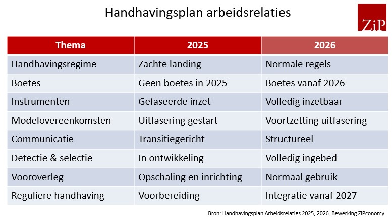 ZiPredactie 12 december 2025 0 reacties Print Rapportage Belastingdienst handhaving schijnzelfstandigheid: 800 bedrijfsbezoeken, arbeidsmarkteffect zichtbaarGelijk aantal bedrijfsbezoeken in overgangsjaar 2025. Belastingdienst publiceert hernieuwd handhavingsplan. Cijfers tonen aan dat meer zzp’ers overstappen over naar loondienst. Het kabinet publiceert hernieuwd handhavingsplan, wil door met Vbar en ziet effecten: meer zzp’ers overstappen over naar loondienst. De Belastingdienst heeft dit jaar 842 bedrijven bezocht om na te gaan of zij voldoen aan wet- en regelgeving rond schijnzelfstandigheid. Bij 237 bedrijven is gestart met een boekenonderzoek. Dat is een zwaardere controle; een bedrijfsbezoek geldt als een meer oriënterend gesprek waarna bijvoorbeeld een waarschuwing kan worden gegeven. Het effect van de intensivering van de controles en alle communicatie over het opheffen van het handhavingsmoratorium per 1 januari 2025 is ook terug te zien in arbeidsmarktcijfers. Het aantal zzp’ers daalt. Dat – en meer – schrijven minister Paul en staatssecretaris Heijnen in een brief aan de Kamer. Inzet Belastingdienst Zoals afgesproken heeft de Belastingdienst 80 fte ingezet op de handhaving schijnzelfstandigheid. Dat verloopt volgens de bewindspersonen volgens planning. Het aantal bezoeken is – zoals vooraf ook aangekondigd – niet toegenomen. Wat veranderd is, is de eventuele consequentie van een onderzoek. Vanaf 2025 kunnen er weer naheffingen worden opgelegd; na 2026 kan er weer worden beboet. 2024 2025 (tot en met oktober) Totaal Onderhanden Afgedaan Totaal Onderhanden Afgedaan Bedrijfsbezoeken 1115 370 745 842 436 406 Boekenonderzoeken 312 176 136 237 127 110 Aanwijzingen 20 nvt nvt Nvt Verzoek beoordelen Modelovereenkomsten 166 63 103 nvt nvt Nvt Verzoeken verzekeringsplicht 305 42 263 269 74 195 In de brief staat uitgelegd dat de medewerkers van de Belastingdienst een groot deel van hun tijd bezig zijn met uitleg en informatie, om zo opdrachtgevers te ondersteunen bij het beoordelen van de arbeidsrelatie en het goed toepassen van fiscale regels. Het blijkt dat opdrachtgevers na zo’n bedrijfsbezoek vaak vrijwillig besluiten om de processen rondom het inhuren van arbeidskrachten te versterken. In dat geval vindt er geen boekenonderzoek plaats, mogelijk wel een extra bezoek om te controleren of de intenties ook zijn omgezet in daden. Zachte landing Het kabinet bevestigt dat de periode van een ‘zachte landing’ aan het einde van dit jaar afloopt. De Tweede Kamer verzocht eerder om het in 2025 nog een beetje rustig aan te doen. Daarom begint de Belastingdienst dit jaar in principe met een oriënterend bedrijfsbezoek. Na 1 januari wordt dat anders. Vanaf dan kunnen er weer boetes worden opgelegd en zal sneller worden gestart met een meer formeel boekenonderzoek.Eerder dit jaar nam de Kamer een motie aan om de periode van de zachte landing te verlengen. Het kabinet gaf snel daarna aan die motie niet te zullen uitvoeren, omdat dat “goed gedrag ontmoedigt” en juist partijen bevoordeelt “die geen werk hebben gemaakt van de aanpak van schijnzelfstandigheid”.Het kabinet laat in haar brief weten vast te houden aan dat standpunt. Communicatie Paul en Heijnen leggen in de Kamerbrief verder uit dat bij beide ministeries het besef aanwezig is dat er behoefte blijft aan meer informatie. Naast de lopende communicatiecampagnes heeft de Belastingdienst daarom toch ook weer apart Handhavingsplan Arbeidsrelaties 2026 opgesteld, met de titel ‘Handhaven volgens de normale regels.” Na 2026 moet alles weer ‘normaal’ zijn en is een en ander geïntegreerd in de regulering handhaving Verder wordt in de brief verwezen naar de website ‘hetjuistecontract.nl’. Daar zijn nieuwe praktijkvoorbeelden uit sectoren aan toegevoegd. Het gebruik van de webmodule is afgenomen; de bewindspersonen weten niet waardoor dat komt. Nieuwe wetgeving Naast handhaving en communicatie is en blijft er behoefte aan nieuwe wetgeving. Het kabinet zet daarom de Vbar door. Deze wet, die bestaande rechterlijke uitspraken moet codificeren, moet voor de markt, de uitvoeringsorganisaties en de rechtspraak inzichtelijker maken wanneer als zelfstandige of als werknemer kan worden gewerkt. Binnen de Tweede Kamer is er weinig enthousiasme voor die wet. VVD, D66, CDA en SGP kwamen al met een alternatief – de Zelfstandigenwet – maar dat voorstel is nog verre van gereed. Lees ook: Kabinet dringt aan op spoedige behandeling Vbar Arbeidsmarkteffecten De effecten van het beleid meetbaar maken is lastig, zo schrijven de bewindspersonen. Maar door verschillende methoden te gebruiken ontstaat wel een beeld. Analyses op basis van administratieve data (zoals KVK), fiscale aangiften en de Enquête Beroepsbevolking laten namelijk allemaal in meer of mindere mate zien dat zelfstandigen vaker overstappen naar loondienst. Vooral rond eind 2024 is een sterke toename te zien van zzp’ers die hun inschrijving beëindigen en binnen enkele maanden in loondienst gaan werken, zo valt te lezen. Ook zelfstandigen die hun onderneming aanhouden maar minder omzet draaien, bouwen hun zzp-activiteiten vaker af en breiden hun uren in loondienst uit. Deze trend wordt bevestigd door fiscale gegevens: de groep zzp’ers die minder omzet behaalt en tegelijkertijd meer uren in dienstverband werkt, groeit gestaag sinds 2024. Tegelijkertijd wordt de groep zelfstandigen die juist meer omzet draait en minder afhankelijk is van loondienst kleiner. Uit de Enquête Beroepsbevolking blijkt bovendien dat steeds meer mensen hun hoofdbaan verschuiven van zelfstandigheid naar loondienst, wat erop wijst dat het zwaartepunt van hun werkinkomen vaker bij een werkgever komt te liggen dan in de eigen onderneming. Op 18 december spreken de twee bewindspersonen met de Tweede Kamer over het handhavingsbeleid en de gevolgen daarvan. handhaving wet DBA, handhavingsplan Print Over de auteur Over ZiPredactie De ZiPredactie plaatst hier interviews en eigen artikelen. Daa