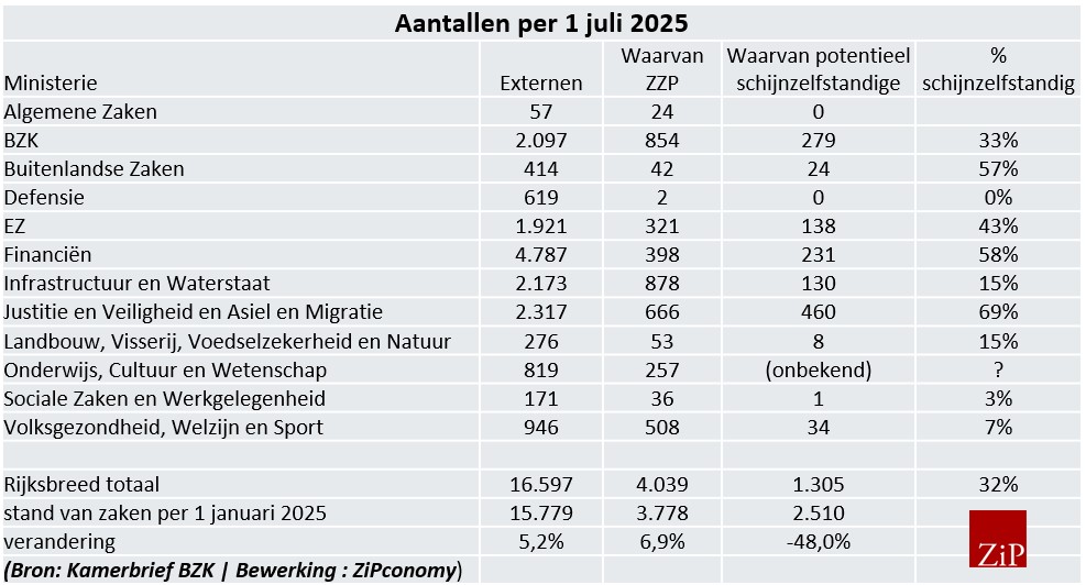 ZiPredactie 17 december 2025 0 reacties Print In juli werkten er nog steeds 1.300 schijn-zzp’ers bij de RijksoverheidHet aantal schijnzelfstandigen bij ministeries is flink afgenomen. Het totale aantal zelfstandigen dat (rechtstreeks) actief is bij de Rijksoverheid groeit overigens wel. Op 1 juli 2025 werkten er nog 1.305 potentiële schijnzelfstandigen bij de Rijksoverheid. Dat was ongeveer een derde van het totale aantal zelfstandigen dat op de verschillende ministeries werd ingehuurd. Een half jaar eerder, op 1 januari 2025 – tevens de datum waarop het handhavingsmoratorium afliep – was dat aantal nog 2.510. Het aantal potentiële schijnzelfstandigen is dus al flink afgenomen, al zijn nog niet alle ministeries in staat cijfers over het aantal ingehuurde externen op te leveren. De ambitie blijft om het aantal schijnzelfstandigen per 1 januari 2026 terug te brengen naar nul. Dat schrijft minister Rijkaart van Binnenlandse Zaken en Koninkrijksrelaties, het coördinerende departement als het gaat om personeelszaken en inhuur, aan de Tweede Kamer. Het gaat bij deze cijfers om rechtstreeks ingehuurde zzp’ers. Zelfstandigen die via bureaus worden ingehuurd en vervolgens bij ministeries worden ingezet, zijn niet in deze cijfers meegenomen. Ongeveer een kwart van alle inhuur bestaat uit rechtstreeks ingehuurde zzp’ers. Dat percentage is overigens niet gedaald tussen januari en juli. Het totale aantal externen is in die zes maanden gestegen van 15.779 naar 16.597. Het aantal zzp’ers steeg mee: van 3.778 naar 4.039. Niet alle ministeries hebben over heel 2025 een compleet beeld. Het streven is wel om deze informatievoorziening verder op orde te krijgen. Over de Belastingdienst wordt gemeld dat dit onderdeel al op 1 januari 2025 geen schijnzelfstandigen meer aan het werk had. Dat wist toenmalig staatssecretaris Van Oostenbruggen eind vorig jaar al te melden in een interview met ZiPconomy. Beleid Om zzp’ers op een juiste manier in te huren, heeft het ministerie van BZK beleidsinstrumenten ontwikkeld die door alle ministeries zijn vastgesteld. Daarin wordt onder andere bepaald dat departementen hun externe inhuur en welk deel daarvan kan worden aangemerkt als potentieel schijnzelfstandig moeten bijhouden, zo stelt Rijkaart. Die instrumenten moeten departementen ook ondersteunen bij de beoordeling van de arbeidsrelatie met ingehuurde zelfstandigen. Verder zorgt het ministerie ervoor dat departementen onderling van elkaar kunnen leren, zodat, schrijft de minister, “de afbouw van schijnzelfstandigheid zo zorgvuldig mogelijk gebeurt”. rijksoverheid Print Over de auteur Over ZiPredactie De ZiPredactie plaatst hier interviews en eigen artikelen. Daarnaast persberichten, aankondigingen of (met toestemming) overgenomen artikelen. (contact: info[AT]zipconomy.nl) Bekijk alle berichten van ZiPredactie