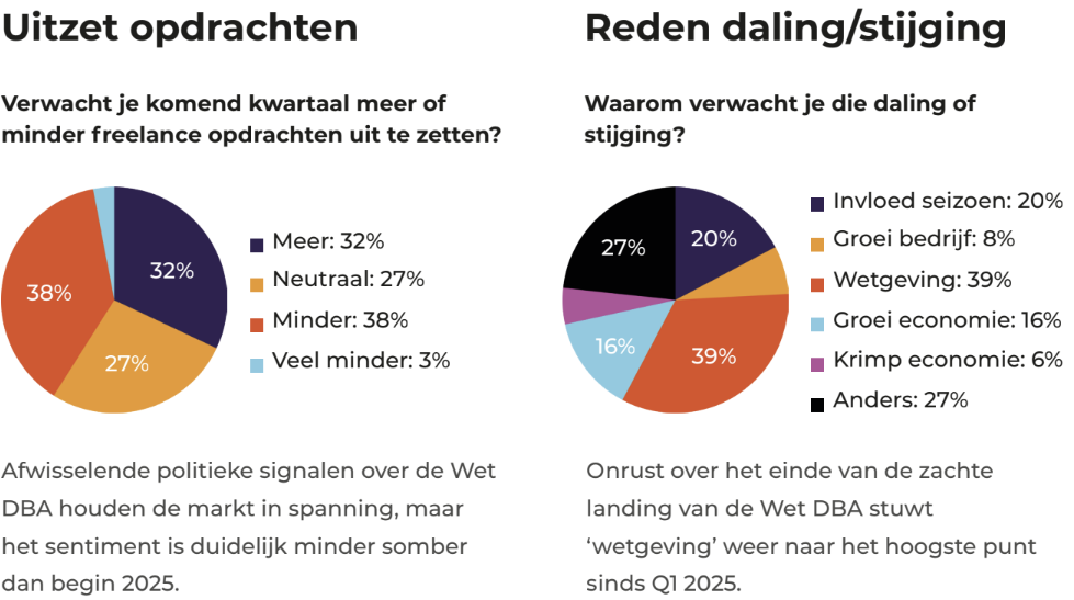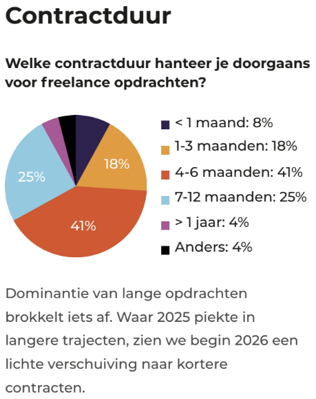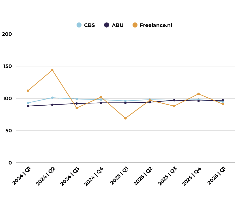 Freelance.nl 18 februari 2026 0 reacties Print Freelance Markt Index Q1 2026: de zzp-markt herstelt langzaam, onzekerheid blijftHoewel opdrachtgevers nog steeds onzeker zijn, gaat het beter met de freelancemarkt dan een jaar geleden. Uit de nieuwste Freelance Markt Index blijkt dat het aantal opdrachten daalt, maar dat de markt stabiliseert.Onzeker, maar stabieler dan voorheen. Dat is de huidige status van de zzp-markt. In het eerste kwartaal van 2026 komt de Freelance Markt Index (FMI) uit op 95. De vraag naar zelfstandig professionals daalt dus nog, maar flink minder dan het dieptepunt een jaar geleden. Kwartaalmonitor De FMI is een kwartaalonderzoek op basis van gegevens van het Centraal Bureau voor de Statistiek (CBS), de Algemene Bond Uitzendondernemingen (ABU) en een telefonische enquête onder 125 opdrachtgevers op Freelance.nl. De index geeft een beeld van vraag, aanbod en vertrouwen in de freelancemarkt. Het gaat specifiek om zzp’ers die hun eigen arbeid verkopen aan zakelijke opdrachtgevers. Stijgende lijn De impact van de intensievere handhaving op schijnzelfstandigheid is duidelijk te zien in de indexcijfers. In het eerste kwartaal van 2025 kelderde de index naar 86, het dieptepunt sinds corona. De periode daarna herstelde de markt voorzichtig, met pieken in het tweede (97) en vierde kwartaal (100). De index had weliswaar een zomerdip (94), maar die was wel opvallend minder diep dan in eerdere zomerperiodes. In het vierde kwartaal herstelde het evenwicht naar 100, maar de verwachting is dat het aantal opdrachten in het eerste kwartaal van 2026 weer iets zal afnemen. Bron: Freelance Markt Index Q1 2026 Volgens de onderzoekers herstelt de markt zichtbaar, maar blijft er onzekerheid heersen. Er is tenslotte nog steeds geen nieuwe wetgeving rondom werken met zelfstandigen. Ondertussen gaat handhaving op schijnzelfstandigheid door. “De acute paniek rondom de handhaving is weg, de onzekerheid blijft”, schrijven zij. Bron: Freelance Markt Index Q1 2026 Invloed van de onzekerheid rondom de zachte landing “Het nieuwste indexcijfer is beïnvloed door het aangekondigde einde van de zachte landing van het handhavingsmoratorium”, vertelt contentmanager Stefan Postma van Freelance.nl. “We interviewden de respondenten namelijk eind december, toen nog niet bekend was dat de zachte landing is verlengd.” De handhaving op schijnzelfstandigheid begon in 2025 met een overgangsregeling. Dat betekent dat de Belastingdienst niet direct streng straft en beboet. Werkgevers krijgen de mogelijkheid om hun werkwijze aan te passen na een bedrijfsbezoek. Na veel discussie besloot het kabinet in december dat de Belastingdienst ook in 2026 nog geen verzuimboetes oplegt. Lees meer over deze gedeeltelijke verlenging van de ‘zachte landing’. Contractduur en uurtje-factuurtje Bron: Freelance Markt Index Q1 2026 Het betalen van freelancers per uur blijft de norm (85%). Werken op projectbasis (ook wel Statement of Work) gebeurt slechts in zeven procent van de gevallen, maar wordt wel populairder. Ook dit hangt samen met de toegenomen handhaving. Lees ook: Klein beginnen met Statement of Work = groot effect voor je organisatie Bron: Freelance Markt Index Q1 2026 Uit de enquête blijkt dat opdrachtgevers vaker werken met korte contracten voor zzp’ers dan voorheen. Het grootste gedeelte (41%) werkt met contracten van vier tot zes maanden. Slechts vier procent werkt met zzp-opdrachten voor meer dan een jaar. Hybride werken is de nieuwe norm In deze editie van de FMI vroegen de onderzoekers respondenten ook naar het beleid rondom werken op afstand. Daaruit blijkt dat respondenten willen dat niet alleen vaste medewerkers, maar ook freelancers vaker op kantoor werken. In de praktijk werken minder freelancers volledig online dan voor de coronacrisis (-25%). Maar ook het aantal zzp’ers dat volledig op kantoor werkt, daalde met 53 procent. Bron: Freelance Markt Index Q1 2026 Inmiddels wordt voor ruim de helft van alle opdrachten de fysieke aanwezigheid per situatie bepaald. “Opvallend is dat freelancers hierin nauwelijks afwijken van de rest van werkend Nederland”, schrijven de onderzoekers. Het CBS concludeerde begin 2024 namelijk dat 52 procent van alle werkenden hybride werkt. Onder freelancers is dat 56 procent. Meer weten? Download hier het volledige rapport. FMI, Freelance.nl, freelancemarkt, zzp-debat, zzp-markt Print Over de auteur Over Freelance.nl Als marktleider verbindt Freelance.nl al meer dan 20 jaar freelancers en organisaties aan elkaar. Met meer dan 350.000 actieve freelancers en meer dan 40.000 opdrachten per jaar is Freelance.nl hét grootste freelance platform van Nederland. Bekijk alle berichten van Freelance.nl