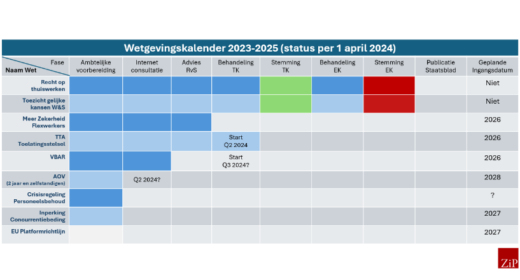 Professioneel inhuren Wetgevingskalender arbeidsmarkt. Een update 22 april 2024 door ZiPredactie Welke arbeidsmarkthervormingswetten zitten er ook alweer in de pijplijn? En vooral: waar in die pijplijn zitten ze eigenlijk? In de ZiPconomy podcast ZiPtalk gaven Narada Bouwland en Hugo-Jan Ruts een overzicht. [Lees meer …]